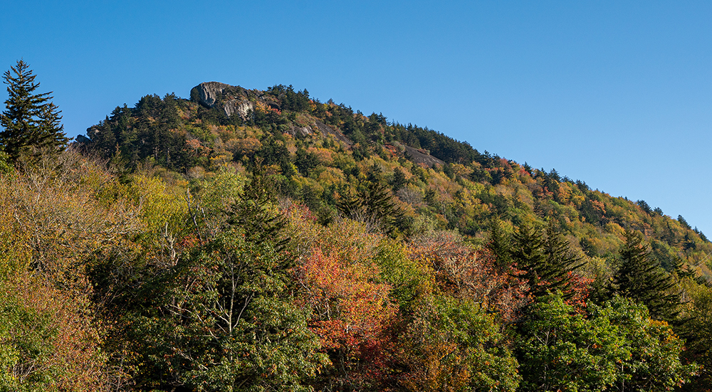 Autumn colors are glowing beneath Linville Peak, as seen from Cliffside picnic area on Grandfather Mountain. (Photo by Skip Sickler)